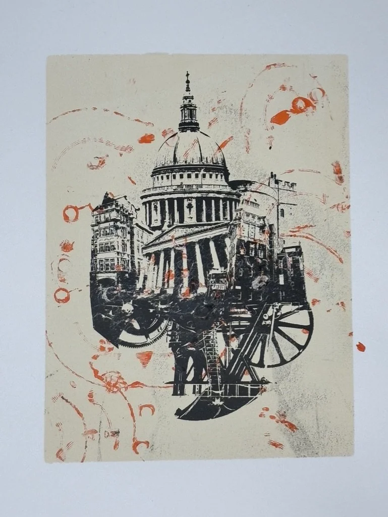 The building is a photo I shot in Paris and the treads are from a tank at the War Museum in Seoul. It was printed using a silicone plate with acrylic paint.