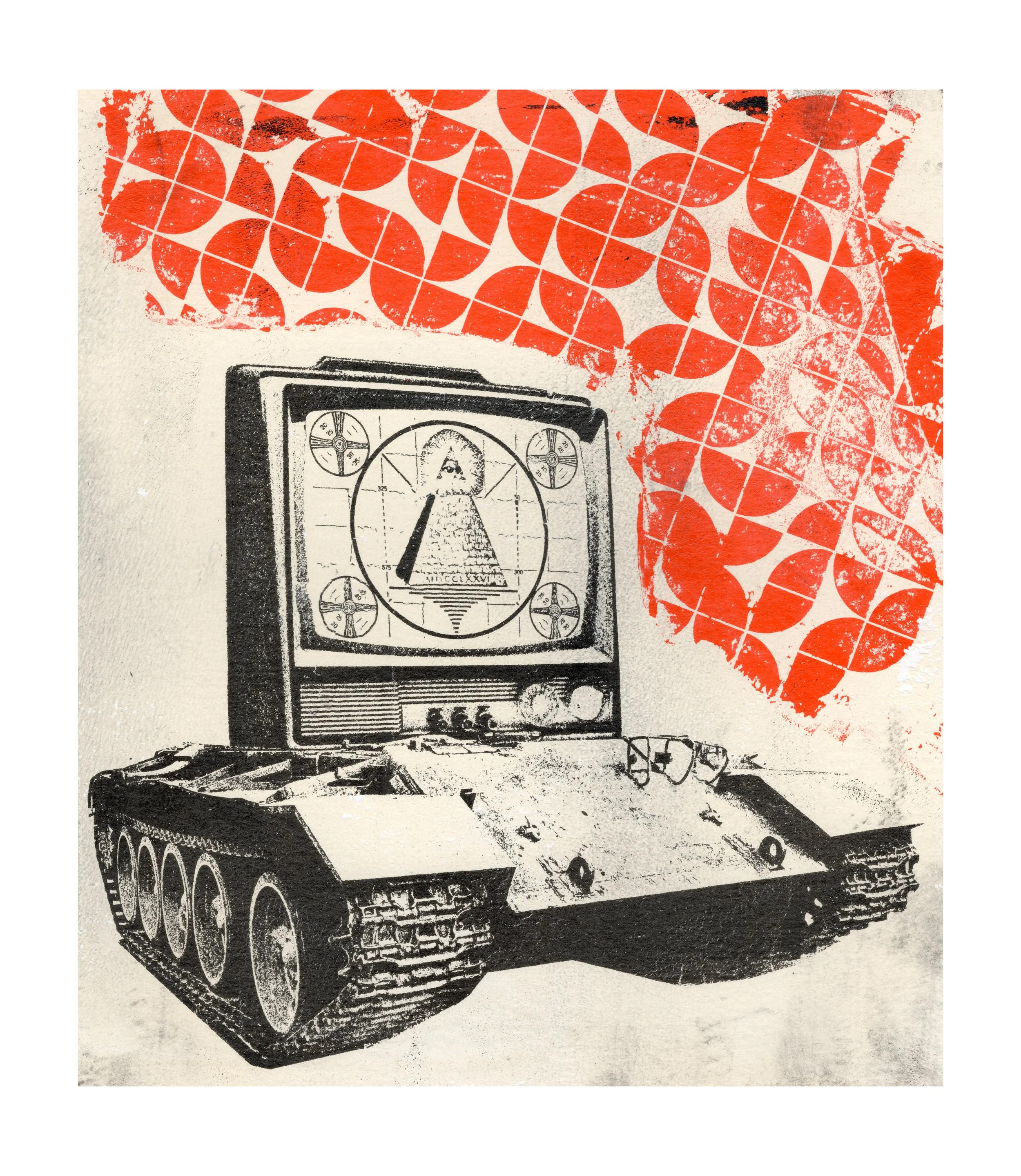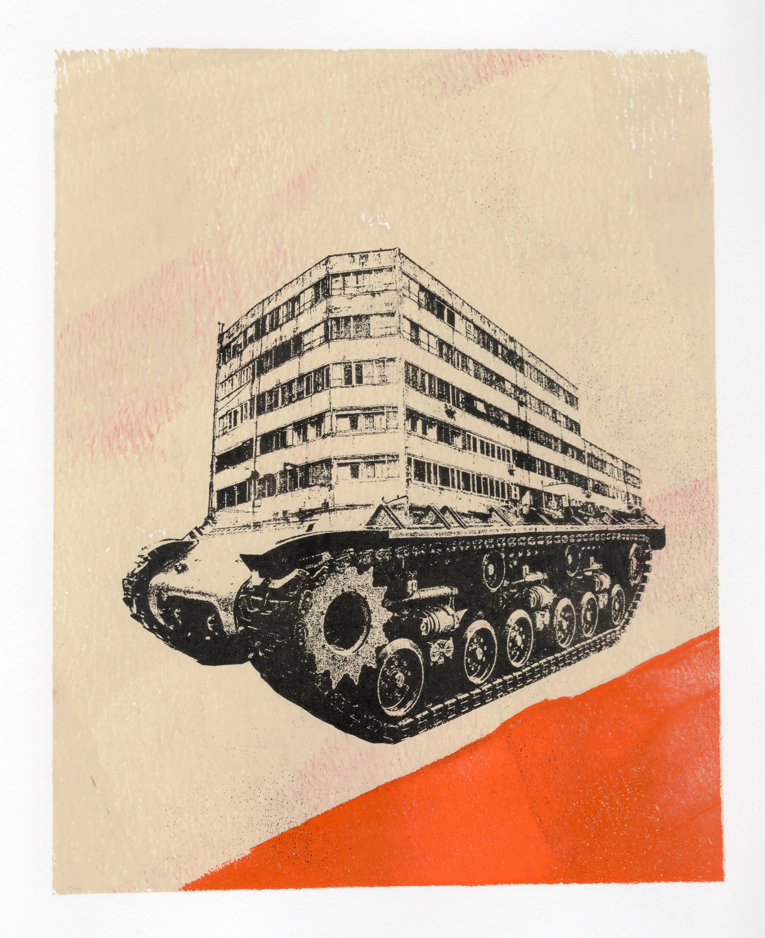 The building is a photo I shot in Paris and the treads are from a tank at the War Museum in Seoul. It was printed using a silicone plate with acrylic paint.